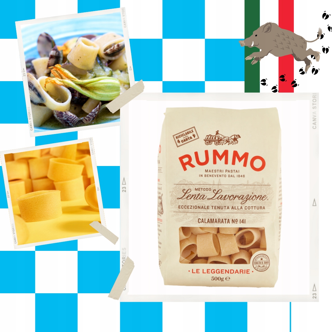 Makaron Włoski RUMMO Calamarata n.141 to wyjątkowy makaron w kształcie grubych, szerokich pierścieni, które inspirowane są kalmarami, stąd jego nazwa. Dzięki swojemu unikalnemu kształtowi, Calamarata n.141 doskonale komponuje się z bogatymi, wyrazistymi sosami, szczególnie tymi na bazie owoców morza, jak również z gęstymi sosami pomidorowymi czy kremowymi. Jest idealnym wyborem do klasycznych dań kuchni neapolitańskiej, ale również do kreatywnych przepisów z warzywami, mięsem lub serami.